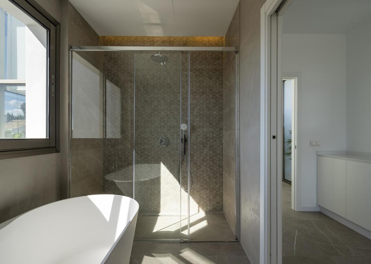 Planta superior: dormitorios adicionales, incluida la suite principal con bañera independiente y acceso a terrazas privadas, algunas con vistas al mar.